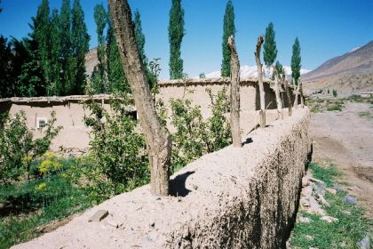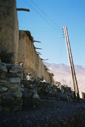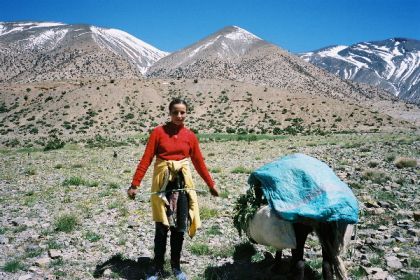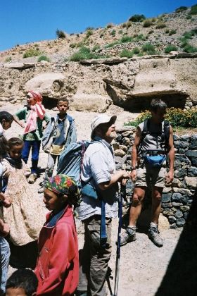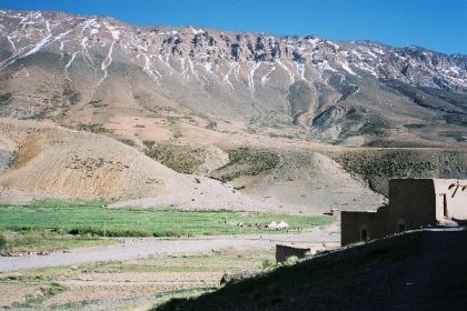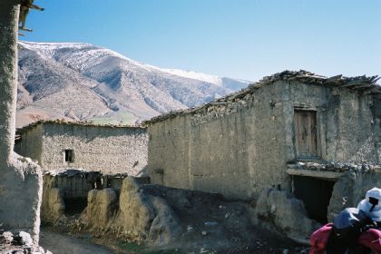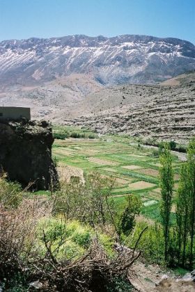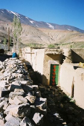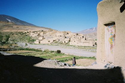 Je vais faire trois pas dans le village, étagé au pied de la soulane. De là, la crête d'en face, tout d'ocre ravinée de neige, paraît toute proche et se dresse, verticale sur le ciel bleu, telle un génie tutélaire veillant sur village et vallée. Ici, à tour de rôle un homme du village garde les bêtes de ses concitoyens. C'est l'heure du retour du pâturage, et chacun attend qui sa mule, qui sa vache, sur le pas de sa porte, pour la reconduire à l'étable. Je déambule sur les chemins soutenus de murets de pierres sèches, dans le dédale de ruelles séparant les maisons : murs de torchis, charpentes apparentes de rondins de peuplier, fenêtres ornées aux grilles retorses, portes peintes de motifs aux couleurs vives. Les hommes les plus âgés, en chech et djellaba, assis en rangs d'oignons le long des murs, lézardent. Les femmes apparaissent à leur porte, robes chatoyantes dans la lumière calme et dorée de la fin d'après-midi, et disparaissent aussitôt dans la pénombre de leur intérieur.