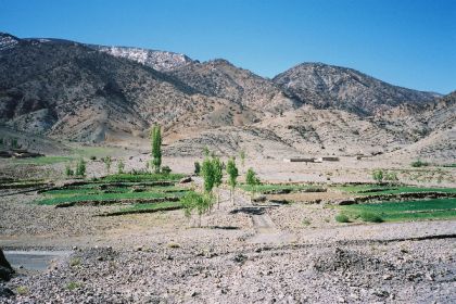 On repart vers l'est, remontant la vallée, pour une étape de liaison vers Taarart. La piste traverse quelques villages aux maisons de torchis. Coupant une boucle de la piste, nous traversons les champs et vergers sur les berges de l'oued, ce qui nous vaut la rencontre inoubliable de Malika.
