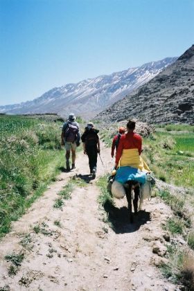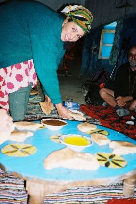 Arrivés au village, elle nous quitte sans un au-revoir, au trot rapide de son âne. Quelle n'est pas notre surprise quand elle nous rattrape en courant à travers la mosaïque des champs, pour nous inviter à boire le thé à la maison de ses parents. On dit oui : Malika est radieuse. Nous sommes accueillis comme des princes dans la maison de terre, accrochée à la soulane, et installés dans la pièce fraîche aux murs peints, aux tapis et coussins multicolores. Nous attendent Saïd son père, Aïcha sa mère, ses soeurs et le petit Saïd son neveu, qui trouve en Lahcen un épisodique tonton de jeu. Puis Malika passe, toute fière, parmi nous avec une aiguière, une bassine et une serviette pour nous laver les mains. Sur les tables basses, rondes, en bois peint, on nous apporte le thé, le pain chaud, l'huile d'olive et la confiture d'oranges. Régal pour le palais mais surtout pour le coeur, tant l'invitation et l'offrande sont amicales et sincères : le plaisir qui brille dans leurs yeux semble au moins aussi intense que le notre. Nous leur donnons en remerciement quelques stylos et autres bricoles qui traînent dans nos sacs. A Marianne qui a eu l'hommage du fauteuil pliant, Malika offre un collier de perles tissées, qu'elle lui noue autour du cou d'un geste joyeux et plein d'affection. Marianne, muette, rosit de confusion. Au moment de partir, on passe par la terrasse qui surplombe la vallée : photos de groupe, les femmes de la maison emmènent Marianne au jardin, on immortalise l'instant. On se dit au-revoir après avoir promis d'envoyer les photos. On retiendra du village de Massou une belle leçon d'hospitalité.
