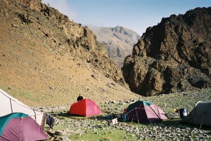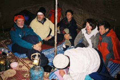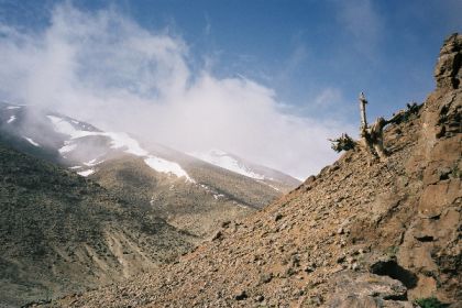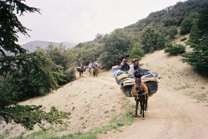 Repas de midi brouillardeux, au programme : l'escapade de Brigitte (rattrapée non sans mal par Brahim) et lentilles dans la brume (sans Sigourney Weaver). Nous reprenons le chemin avec la pluie qui va crescendo, et c'est mouillés et crottés que nous arrivons à la maison forestière de Midkhane. Ne serait le temps, le site est superbe : jardins et verger en fleurs en lisière de forêt, aux pieds des crêtes enneigées. On se réfugie dans la grande tente que les muletiers ont montée à temps.