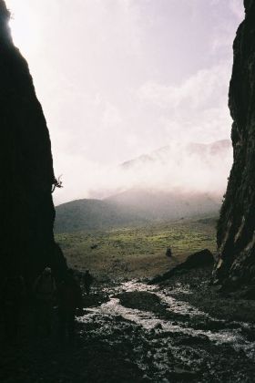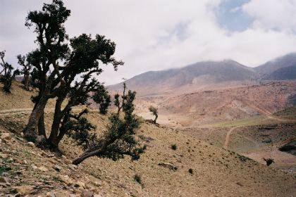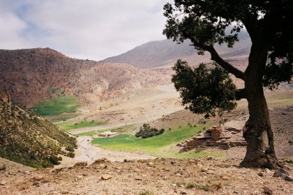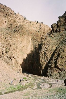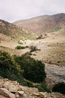 Lever avec un demi-soleil; départ par les gorges d'Ichmi, véritable coup de hache dans la falaise rouge, dans lequel se précipite le torrent surgi de terre sous notre camp. De l'autre côté, ce sont les premiers cèdres et le débouché sur une belle vallée : forêts de chênes verts, buis, cèdres, champs en terrasses, bergeries habitées. Croisant un troupeau, nous faisons la rencontre d'un chien blanc, contrefait mais sympathique, qui se met à nous suivre.