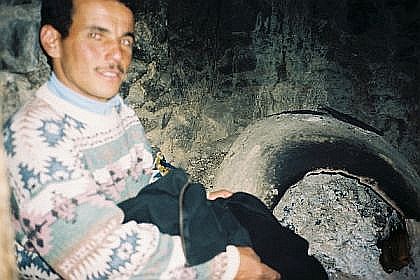 Ils ont aussi trouvé, dans un appentis de la maison, un four traditionnel en terre : ils y allument aussitôt du feu et s'y acagnardent. Pierre, Marianne et moi nous y réfugions une bonne partie de l'après-midi, à papoter avec eux en faisant sécher nos habits trempés. Mohamed a déjà préparé le pain, dont les galettes attendent à côté. Comme je m'y trouve au moment de la cuisson, Lahcen partage le premier pain, fumant, que nous dévorons à belles dents, en une gourmandise hautement symbolique.
