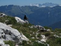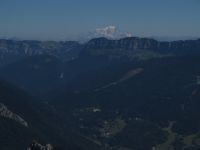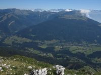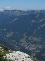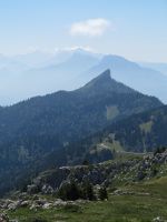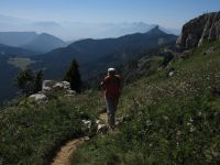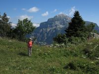 Cette rando présente l'avantage de partir directement de notre camping. Après une rude montée dans la forêt (les pistes de débardage sont raides et défoncées), on poursuit par un sentier de traversée un peu aérien qui longe une grande dalle sous le sommet. La dernière montée (raide!) se fait dans une prairie qui est un véritable jardin tellement elle regorge de fleurs : qu'est-ce que ça doit être au printemps! Au sommet, pause casse-croûte et vue panoramique sur les massifs environnants jusqu'au Mont Blanc. On décide de ne pas redescendre par l'itinéraire de l'aller, et on rejoint la route qui mène au Col de Porte. Après une halte rafraîchissante au bar et l'achat de tomme locale à la fromagerie, on reprend quelques centaines de mètres plus bas, un sentier qui descend dans la forêt, tortueux à souhait mais tellement plus pittoresque que les pistes de débardage de l'aller. On retrouve le fond de la vallée au hameau des Cottaves, et retour au camping par la route. Grande première pour Soize : 1000m de dénivelé dans la journée!